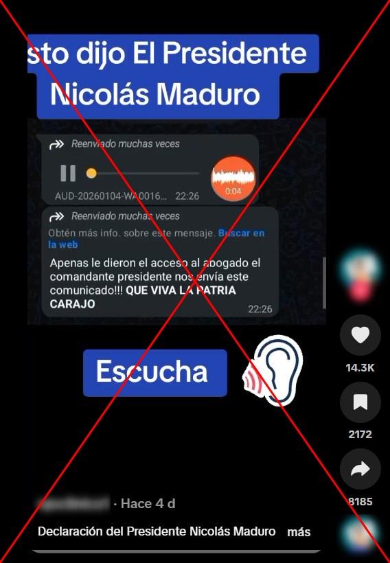 “Mensaje de Audio al mundo y al pueblo venezolano del presidente de la Republica Bolivariana de Venezuela Nicolás Maduro Moros secuestrado por los EEUU en el momento de ascenso a su abogado en el tribunal de Nueva York EEUU lunes 5 de enero 2026”, dice una de las publicaciones que comparten el contenido en Facebook (1, 2) y TikTok (1, 2).