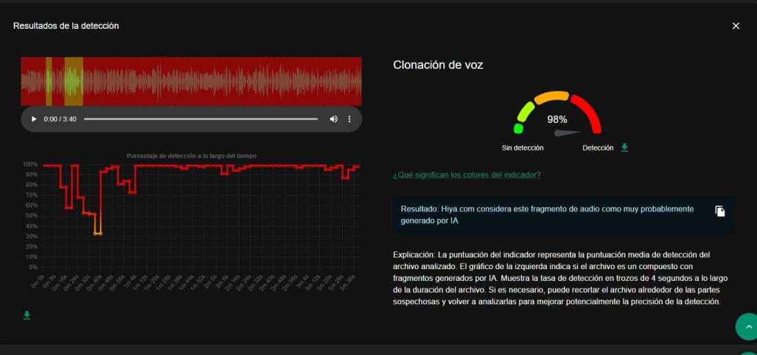 Al analizar el audio con la herramienta Hiya, de InVID-WeVerify, se mostró un 98% de probabilidad de haber sido creado de forma digital.