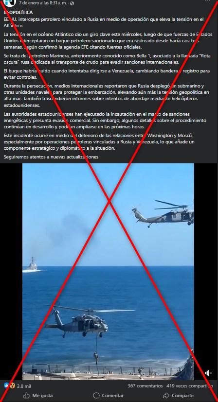 El 7 de enero de 2026, Estados Unidos incautó un buque petrolero vinculado a Rusia en el Atlántico Norte, en el marco del bloqueo de Washington a las exportaciones de petróleo venezolano. En ese contexto, un video de soldados descendiendo desde un helicóptero hacia una embarcación ha sido compartido más de 3.000 veces en redes sociales junto con la afirmación de que muestra esa operación. Sin embargo, la secuencia circula desde octubre de 2025 y corresponde a una demostración militar por el 250 aniversario de la Marina estadounidense.
