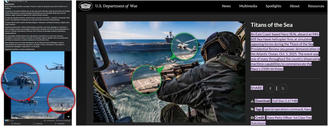 La investigación también condujo a una entrada en el sitio web del Departamento de Guerra con una fotografía de un soldado disparando desde un helicóptero hacia un buque. En la imagen se puede ver una escena similar a la del video viral y varias coincidencias: la rejilla a lo largo de la cubierta del barco, el patrón de líneas en la cubierta y el segundo helicóptero.