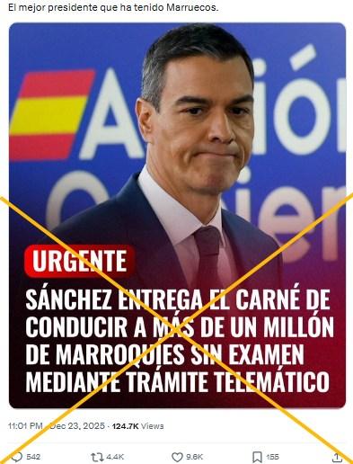 Una captura de pantalla compartida en X asegura que “[Pedro] Sánchez entrega el carné de conducir a más de un millón de marroquíes sin examen mediante trámite telemático”. Y añade: “El mejor presidente que ha tenido Marruecos”.