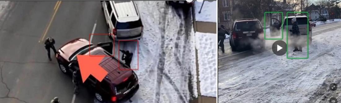 En fotografía viral también aparece un oficial vestido de negro apuntando con un arma del lado derecho del auto, pero imágenes verificadas muestran que un transeúnte con una franela a cuadros estaba en ese lado del auto, no un oficial.