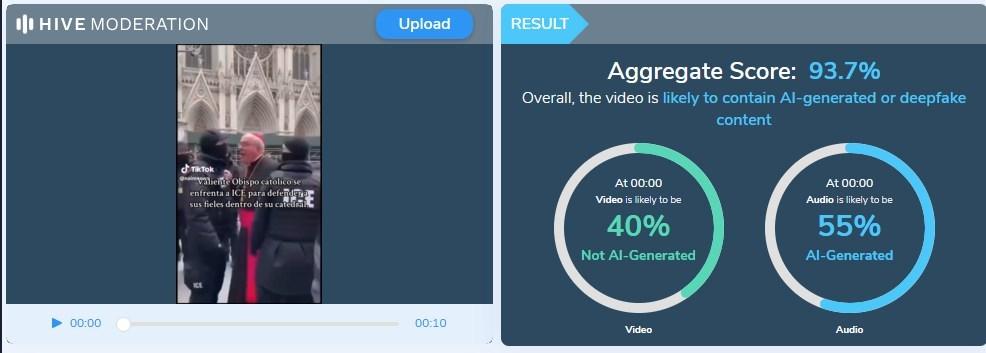 Mientras que otra prueba con la herramienta Hive Moderation del video mostró un 93,7% de posibilidad de haber sido creado digitalmente.