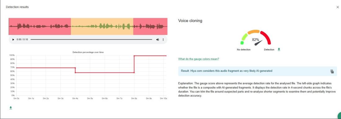 Además, un análisis del audio de la secuencia con la herramienta Hiya, de InVID-WeVerify arrojó un 82% de probabilidades de haber sido creado con IA.