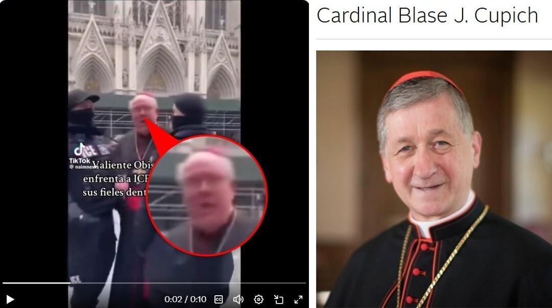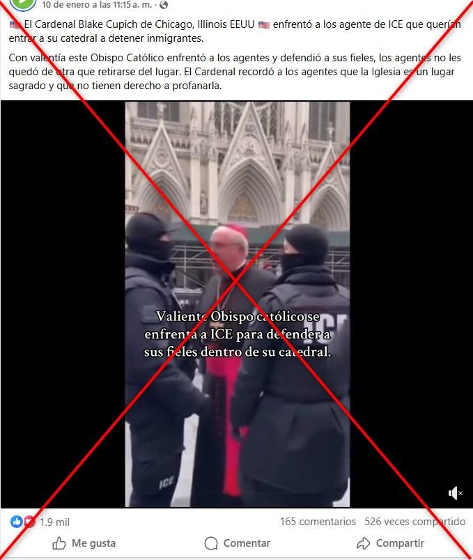 “El Cardenal Blake Cupich de Chicago, Illinois EEUU enfrentó a los agente de ICE que querían entrar a su catedral a detener inmigrantes. Con valentía este Obispo Católico enfrentó a los agentes y defendió a sus fieles, los agentes no les quedó de otra que retirarse del lugar. El Cardenal recordó a los agentes que la Iglesia es un lugar sagrado y que no tienen derecho a profanarla”, dicen publicaciones en Facebook, Instagram, Threads, X y TikTok.