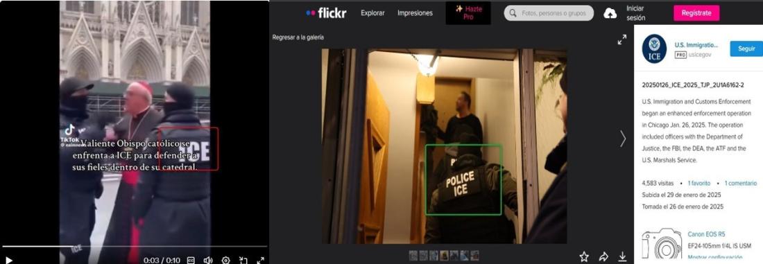 En la secuencia viral, los supuestos agentes federales portan un uniforme con la leyenda “ICE”, pero una búsqueda en el archivo multimedia de esa unidad confirmó que el traje oficial incluye, además, la palabra “Police”.