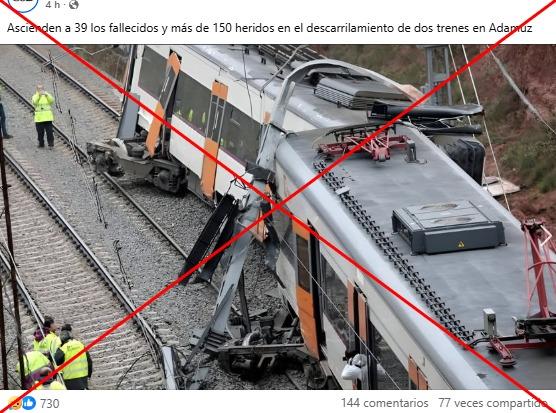 El 18 de enero de 2026, la colisión de dos trenes de alta velocidad en Adamuz, España, dejó al menos 39 fallecidos y 120 heridos, según el balance al día siguiente del suceso. Desde entonces, usuarios en redes sociales difunden imágenes del accidente, entre la que se encuentra la fotografía del descarrilamiento de dos vagones de tren blancos con las puertas naranjas, compartida más de 150 veces. Sin embargo, esta instantánea corresponde al accidente de un tren regional de cercanías en la provincia de Barcelona en 2018.
