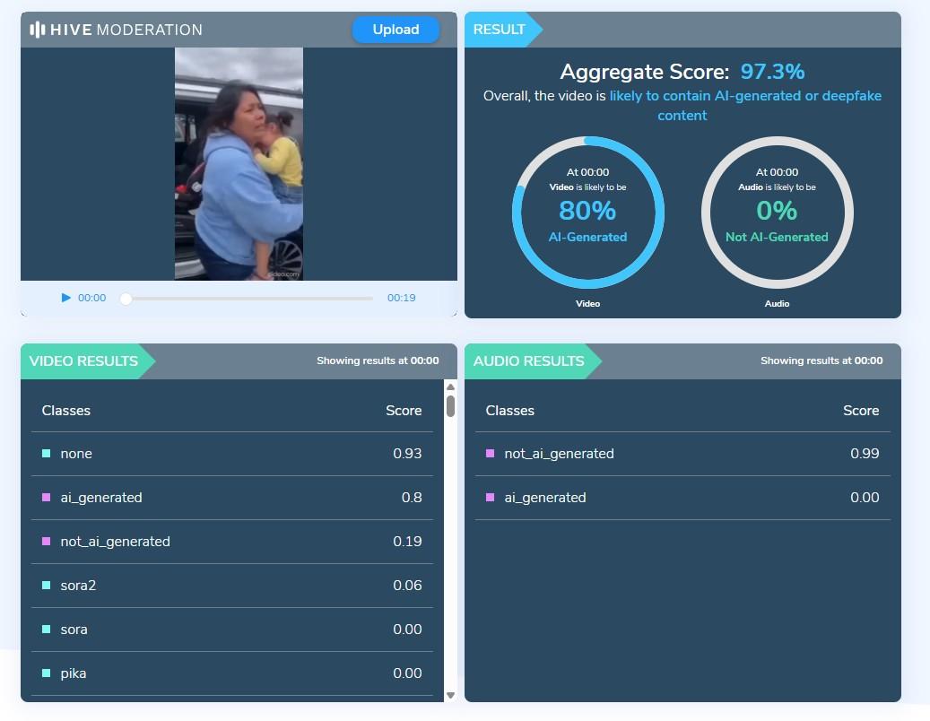 Un análisis con la herramienta Hive Moderation, que identifica si un material fue generado artificialmente, arrojó un 97,3% de probabilidades de que el video haya sido hecho con IA.