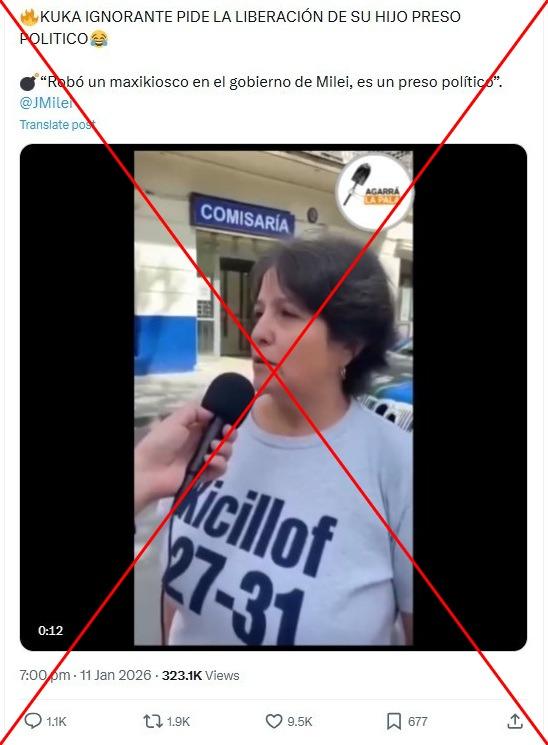 “En Venezuela están liberando presos políticos. Por eso exijo en Argentina que liberen a mi hijo que es preso político”, dice la mujer en la grabación difundida en Facebook. Un hombre que la entrevista con un micrófono le pregunta: “¿Qué hizo su hijo para ser preso político?”, a lo que ella responde: “Asaltó un maxikiosco. Es algo político porque de chico siempre robó y recién ahora cae preso que está [el presidente] Javier Milei”.