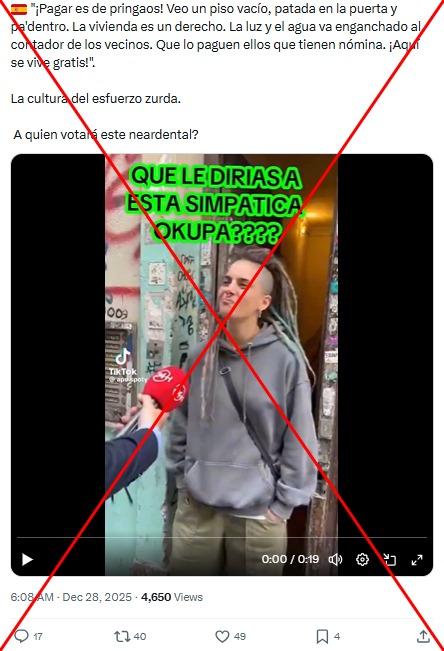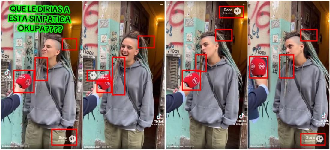 El aumento del precio del alquiler es una de las causas de la crisis de la vivienda en España. En ese marco, en redes sociales circula un vídeo de una supuesta mujer okupa, como se conoce a los que invaden propiedades ajenas, que asegura en una entrevista que “pagar es de pringados [ingenuos]”. La grabación fue compartida más de 2.000 veces desde el 25 de diciembre de 2025. Pero fue hecha con inteligencia artificial (IA): tiene la marca de agua de la herramienta Sora y presenta inconsistencias.