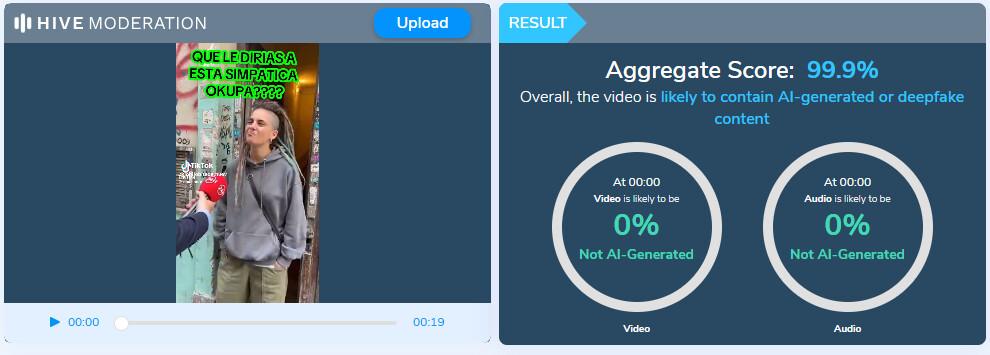 Al analizar el vídeo con la aplicación de detección de contenido creado por IA Hive Moderation, dio como resultado un 99,9% de probabilidad de que fuera generado digitalmente.