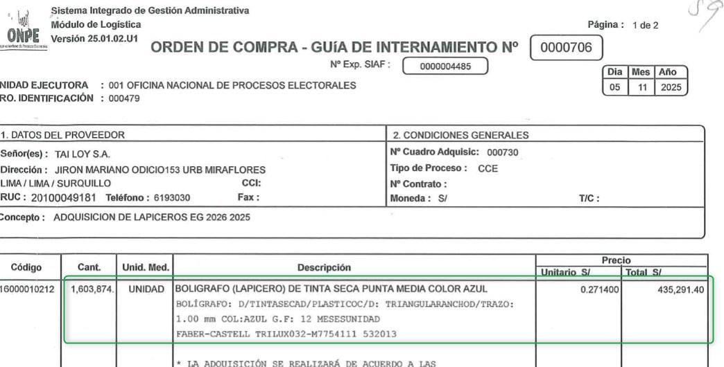 A través de un pedido de acceso a la información a la ONPE, hecho por AFP Factual el 13 de enero y recibido una semana después, se confirmó que en noviembre de 2025 la entidad realizó la compra de 1.603.874 bolígrafos de “tinta seca” color azul de la marca Faber Castell Trilux032, bajo el concepto de “Adquisición de Lapiceros EG - 2026 (2025)”.