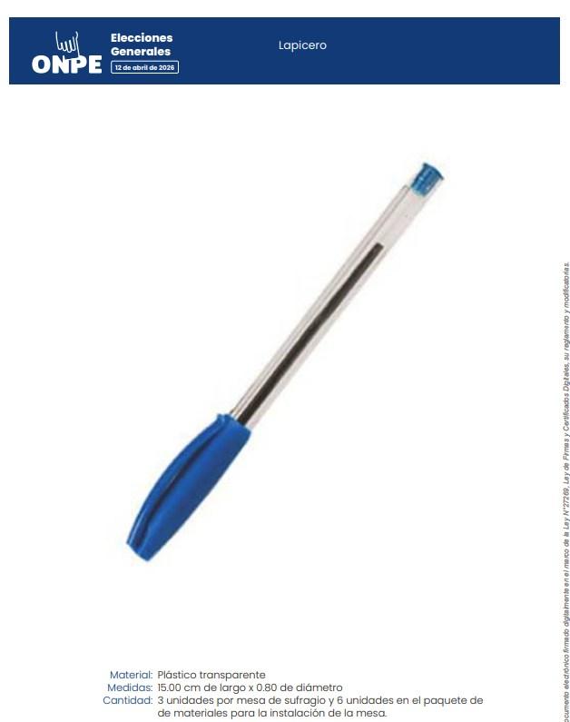Para las elecciones generales de 2026, la ONPE aprobó en septiembre de 2025 el Catálogo de Materiales Electorales para el Voto Convencional. En el documento no figura el modelo de bolígrafo con tinta borrable de la secuencia viral, sino uno similar al modelo Faber Castell usado en el proceso electoral de 2022.