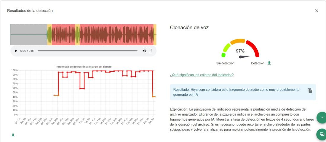 Tras analizar la secuencia con la herramienta Hiya de InVID-WeVerify, que examina si un audio fue generado artificialmente, se detectó 97% de probabilidades de que haya sido generado por IA.