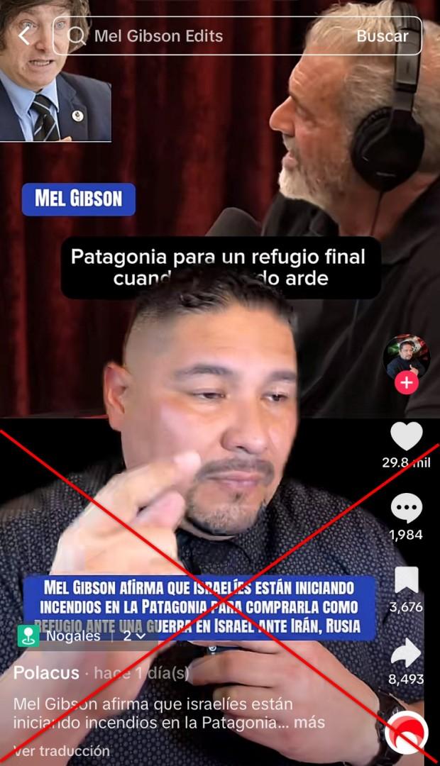 El video, compartido en Facebook, Instagram, Threads y TikTok, inicia con un hombre que asegura que Gibson “acaba de revelar” en un pódcast que el presidente argentino, Javier Milei, tiene un “plan” junto a “empresarios de origen israelí para poblar la Patagonia”.