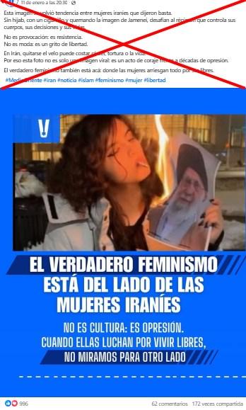 El vídeo o fotos de la misma escena circulan en Instagram y Facebook con el mensaje: “Mujeres en Irán protestan quemando imágenes del líder supremo. Durante las manifestaciones en Irán contra el aumento del costo de vida y el régimen teocrático, mujeres han encendido cigarrillos usando imágenes del ayatolá Alí Jamenei, un acto simbólico de desafio”.