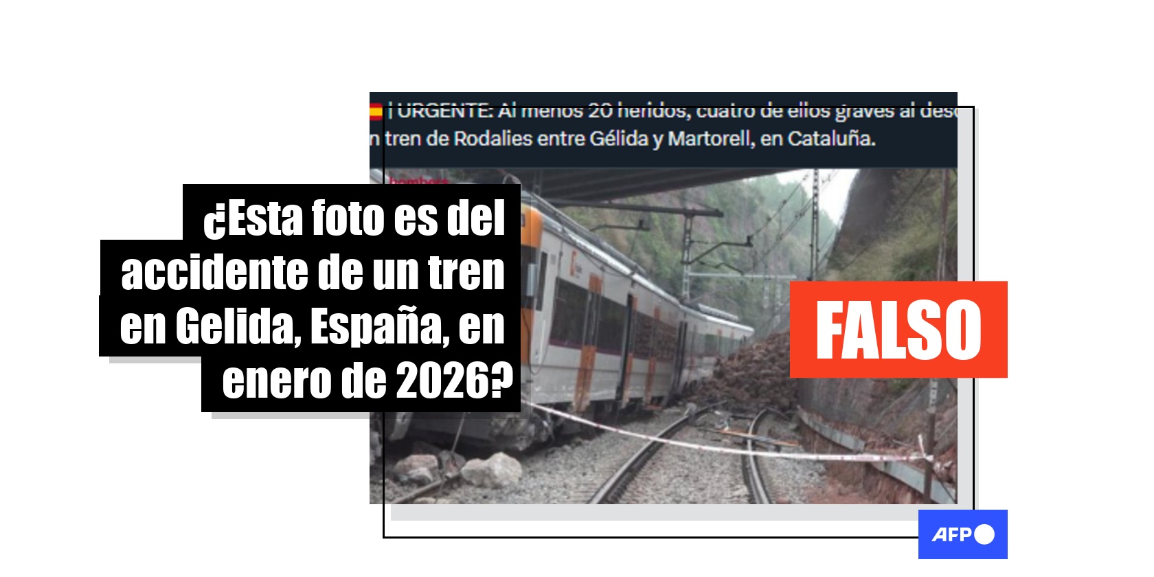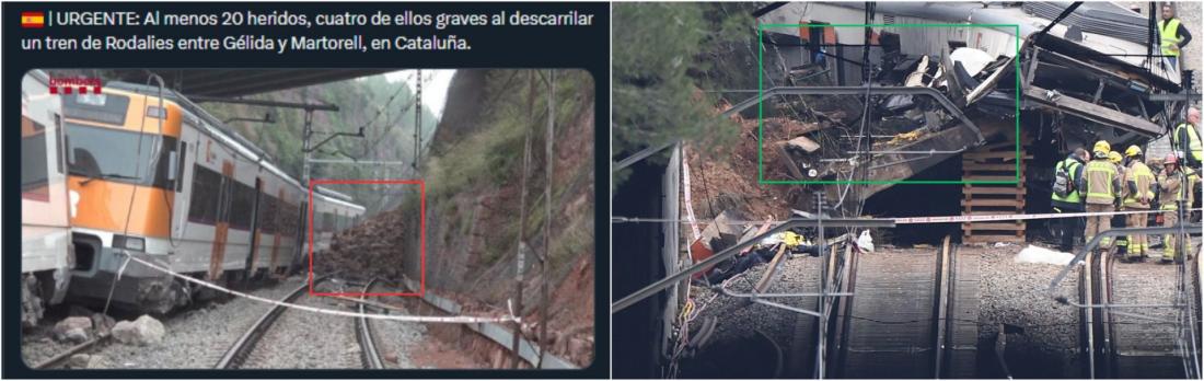 “URGENTE: Al menos 20 heridos, cuatro de ellos graves al descarrilar un tren de Rodalies entre Gélida y Martorell, en Cataluña”, afirma un usuario en X, junto a la imagen viral, también compartida en Facebook, Instagram y YouTube.