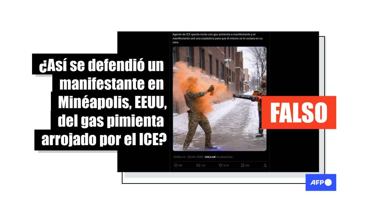 El Servicio de Migraciones y Aduanas de Estados Unidos (ICE) ha utilizado gas pimienta para reprimir las protestas contra los operativos migratorios en Mineápolis, de enero de 2026. En ese marco, más de 1.000 usuarios en redes sociales comparten una imagen que muestra a un hombre repeliendo el gas de un oficial con una máquina sopladora. Sin embargo, el contenido fue hecho con inteligencia artificial (IA).