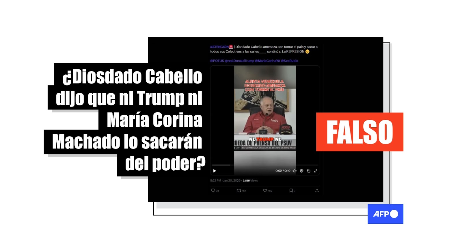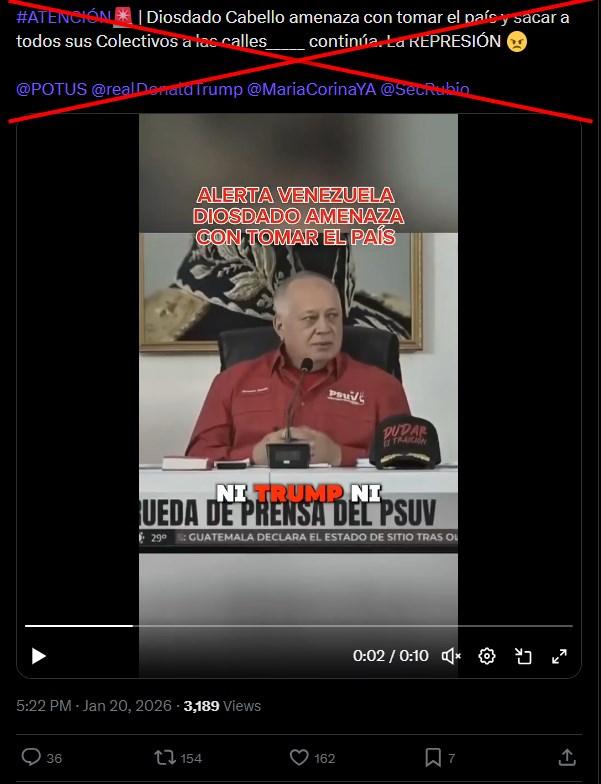 “Que les quede claro, ni Trump ni María Corina nos van a sacar del poder, así tenga que sacar a todos los colectivos a la calles y tomar el país. Nadie me quitará mi país”, dice supuestamente Cabello en el video difundido en Facebook (1, 2), TikTok (1, 2) y X.