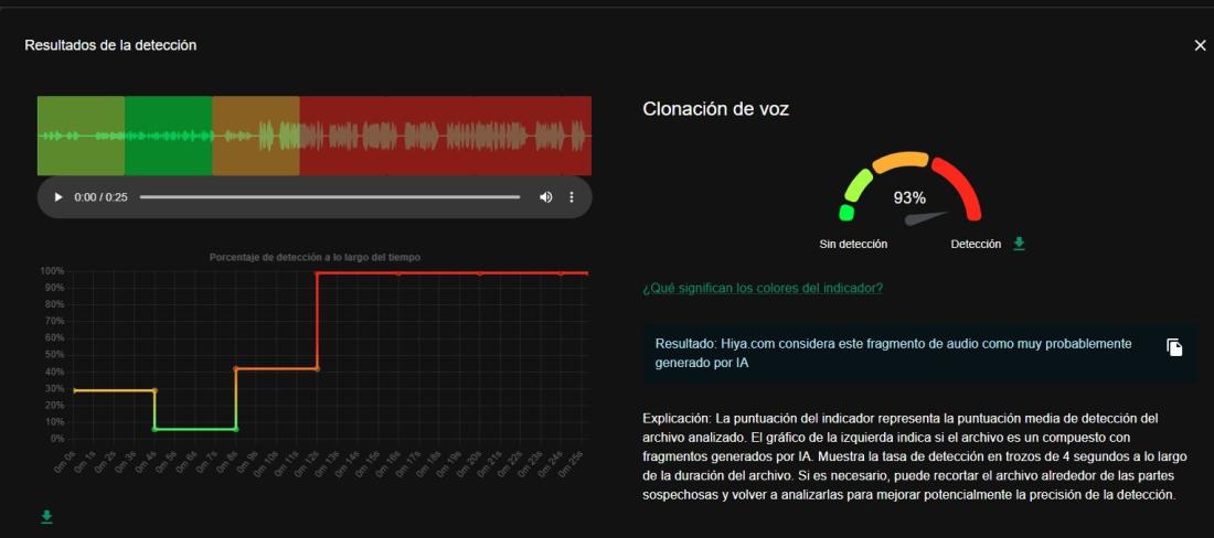 Un análisis con la herramienta detección de clonación de voz con IA de InVID WeVerify arrojó un 93% de probabilidad de que haya sido generado artificialmente.
