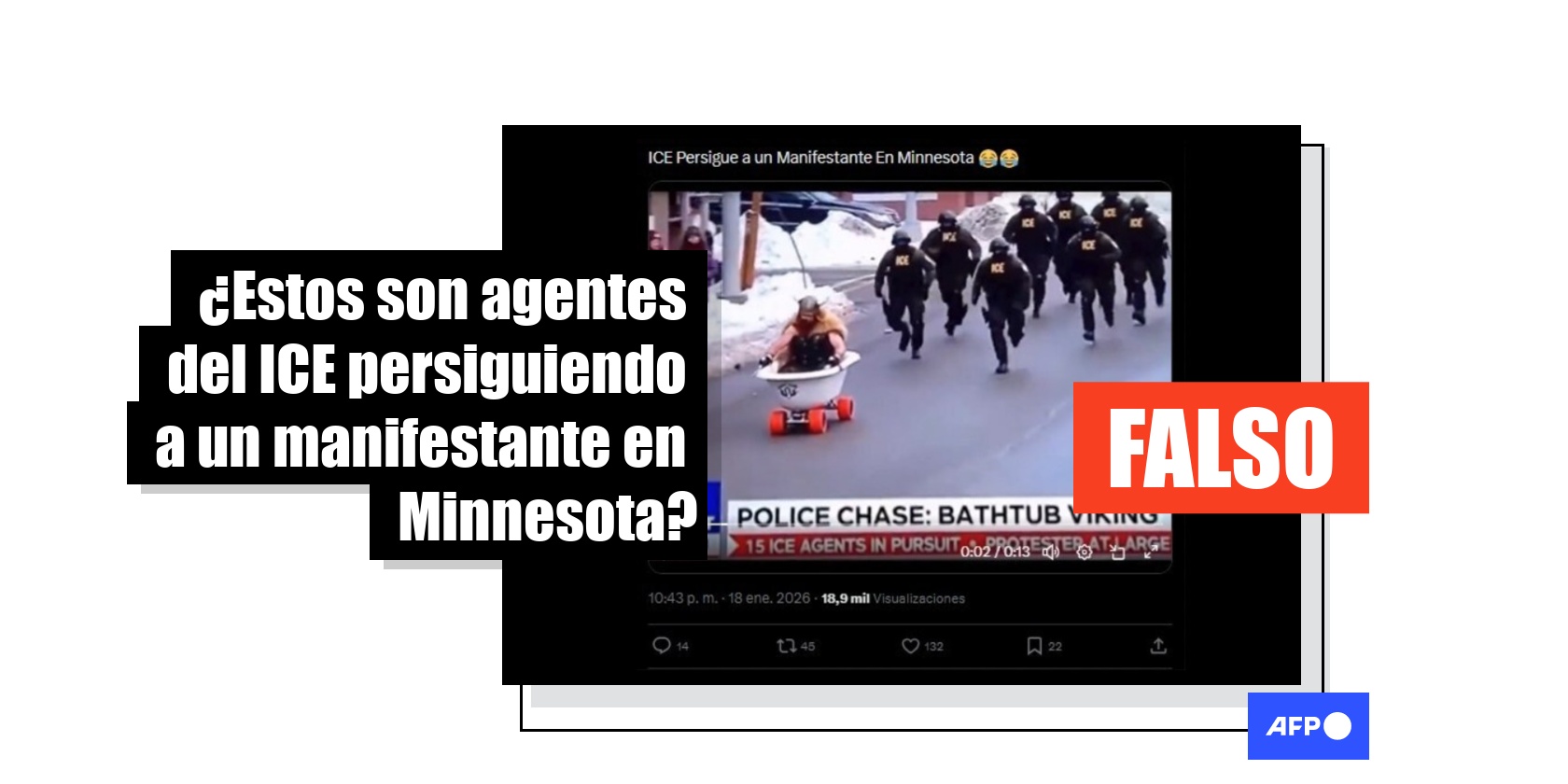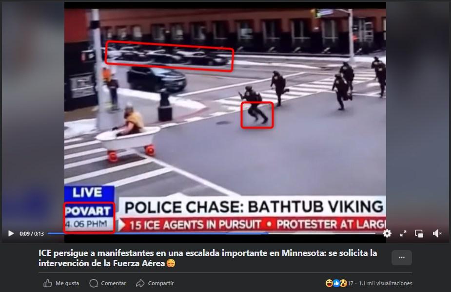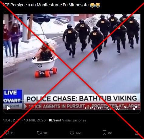 En el video, la voz de una supuesta presentadora de noticias narra en inglés: “Estamos en directo sobre el centro de Mineápolis, donde sí, ese es un manifestante con un disfraz de vikingo montado en lo que parece ser una bañera de porcelana con ruedas. Quince agentes del ICE van tras él, pero miren esto: se está escapando”.