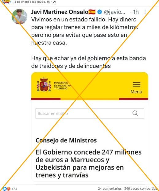 El texto se comparte junto a la captura de una nota de prensa del Ministerio de Industria y Turismo español donde se lee: “Consejo de Ministros. El Gobierno concede 247 millones de euros a Marruecos y Uzbekistán para mejoras en trenes y tranvías”.