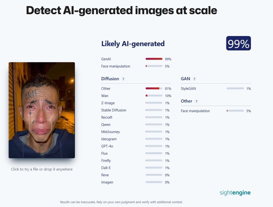 La herramienta Sightengine detectó que hay un 99% de probabilidades de que la imagen haya sido creada digitalmente.