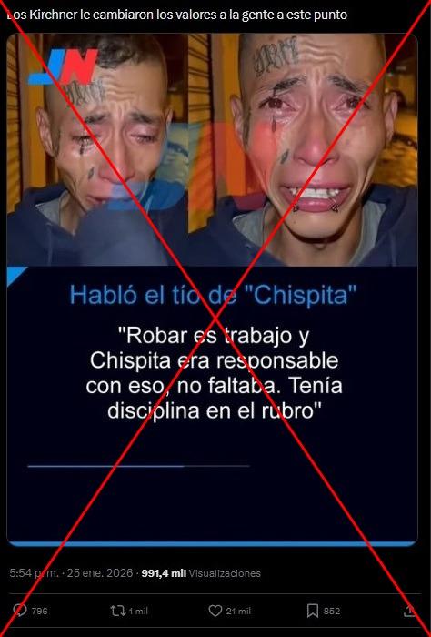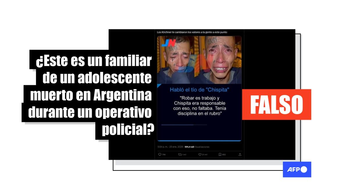 Un operativo policial en Argentina terminó con la muerte de un menor de 12 años, el 21 de enero de 2026. Días después, comenzó a circular en redes sociales una placa que atribuye a un supuesto tío del adolescente, apodado “Chispita”, la frase “robar es trabajo”. Las entradas fueron compartidas más de 1.000 veces. Sin embargo, la gráfica fue creada por una página satírica en Facebook que imita el estilo visual de un medio argentino, y que, además, utiliza una captura de pantalla de un video generado con inteligencia artificial.