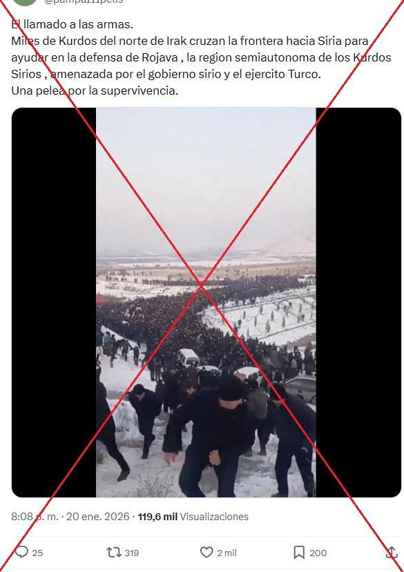El 19 de enero de 2026, el ejército sirio y las Fuerzas Democráticas Sirias (FDS), lideradas por los kurdos, se enfrentaron en Raqqa, una zona autónoma de la etnia kurda en el norte del país, donde el nuevo gobierno sirio intenta consolidar su autoridad. Desde entonces, ha sido compartido en redes sociales más de 500 veces un video de cientos de supuestos kurdos de Irak cruzando a Siria para sumarse al combate de su pueblo. En realidad, se trata de una multitud grabada en 2023 en el club Dengiz Tulpori, en Uzbekistán, donde se realizó una competencia a caballo.