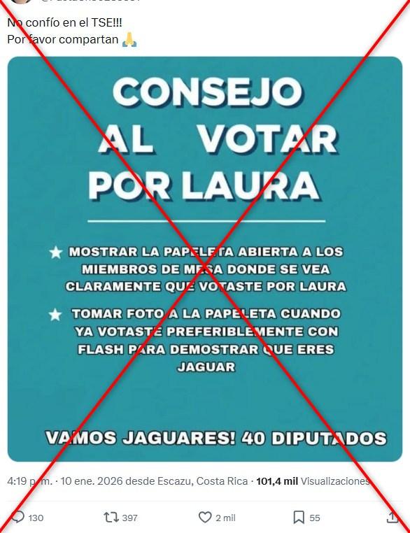 En las elecciones presidenciales de Costa Rica, del 1 de febrero de 2026, está prohibido hacer público el voto o tomar fotografías dentro del recinto de votación. Sin embargo, en los días previos a los comicios, en redes sociales se ha compartido más de 400 veces una imagen que insta a los electores a mostrar su papeleta a los miembros de la mesa y tomarle una foto, además de promover el apoyo a la candidata oficialista Laura Fernández, del Partido Pueblo Soberano (PPSO). Seguir estas instrucciones podría anular el sufragio, de acuerdo con los lineamientos electorales.