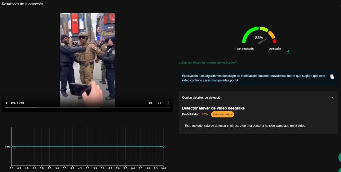 AFP Factual realizó un análisis de las imágenes con la herramienta Deepfake de InVID-WeVerify, que detecta si un video contiene rostros manipulados por inteligencia artificial, y arrojó un 83% de probabilidades.
