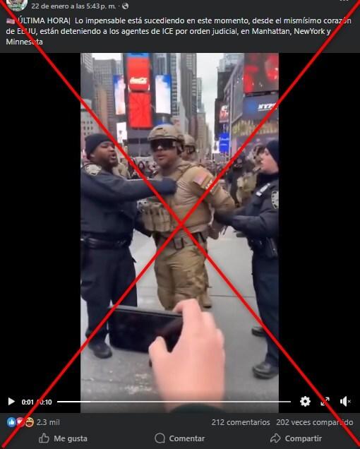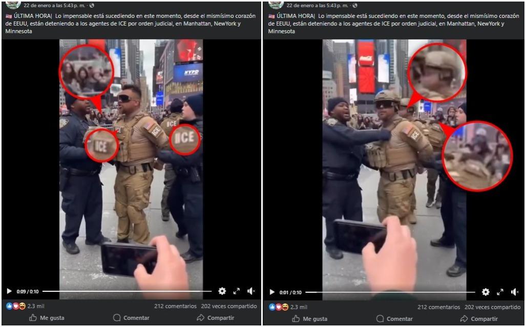 Las publicaciones, que también circulan en Instagram, Threads, X y TikTok, difunden un video que muestra a dos supuestos policías de Nueva York deteniendo a agentes del ICE en Time Square.