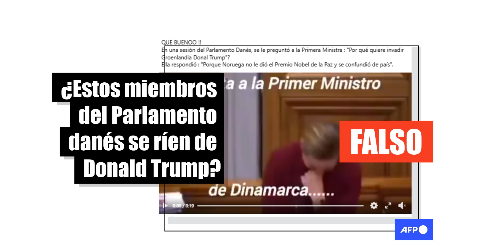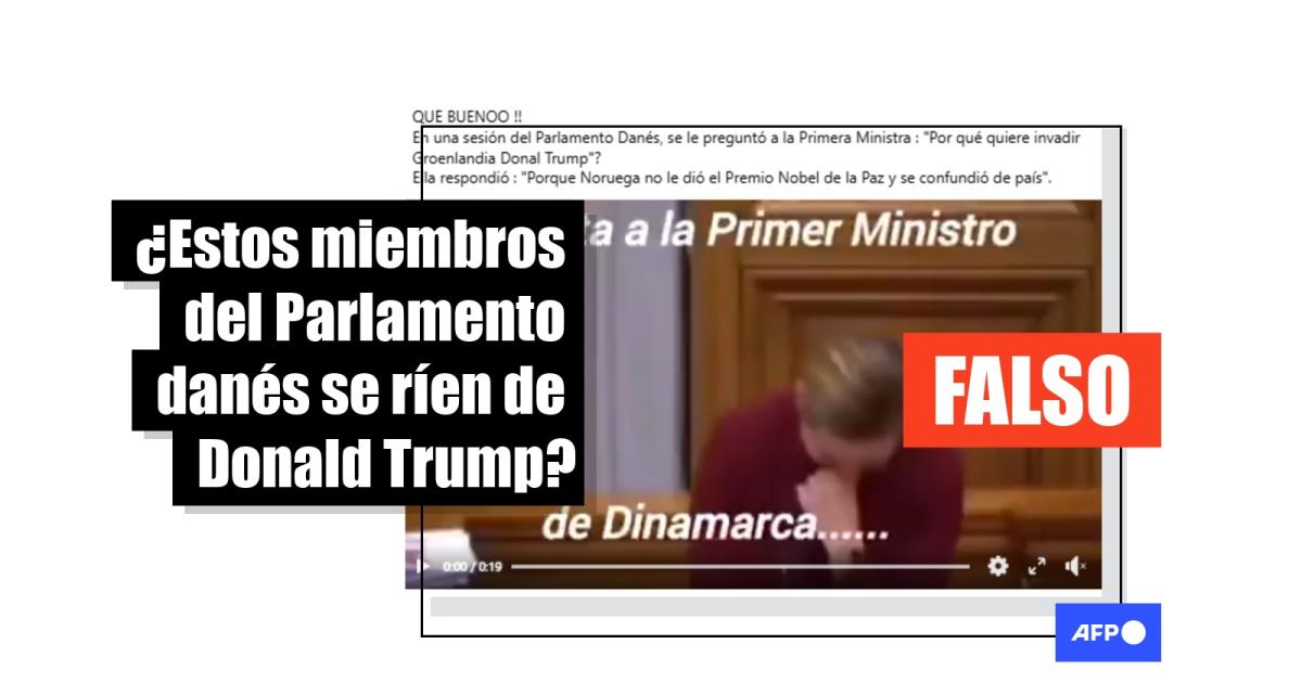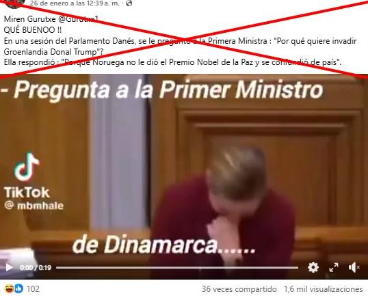 “En una sesión del Parlamento Danés, se le preguntó a la Primera Ministra: ‘Por qué quiere invadir Groenlandia Donal Trump’? Ella respondió: ‘Porque Noruega no le dio el Premio Nobel de la Paz y se confundió de país’”, asegura una publicación en Facebook acompañada de un vídeo en el que la primera ministra de Dinamarca, Mette Frederiksen, aparece riéndose con otros miembros del Parlamento danés.