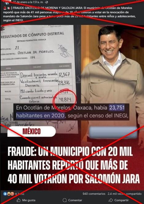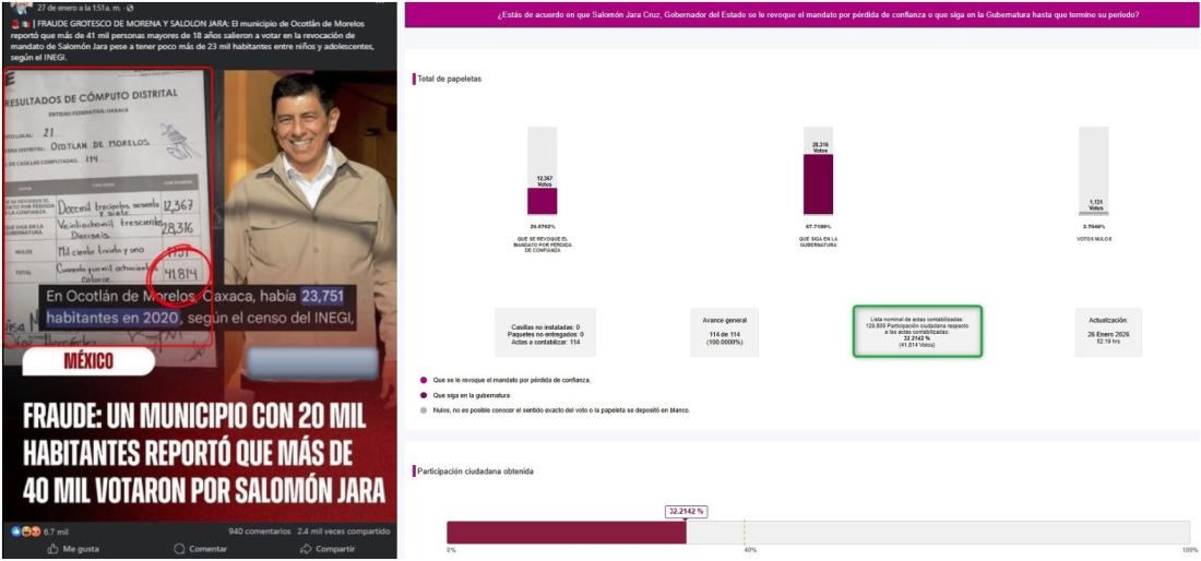 El 25 de enero de 2026, el estado mexicano de Oaxaca realizó una consulta de revocación de mandato para decidir la permanencia del gobernador Salomón Jara Cruz, quien obtuvo 58% de los votos a favor de que siga en el cargo. Tras la votación, entradas en redes sociales, compartidas más de 15.000 veces, denunciaron fraude al comparar erróneamente el número de habitantes del municipio de Ocotlán de Morelos con la cifra de votos en el distrito electoral homónimo. En realidad, los distritos incluyen varias poblaciones, y el 21, al que hacen referencia los mensajes virales, abarca a Ocotlán de Morelos y 32 municipios más.