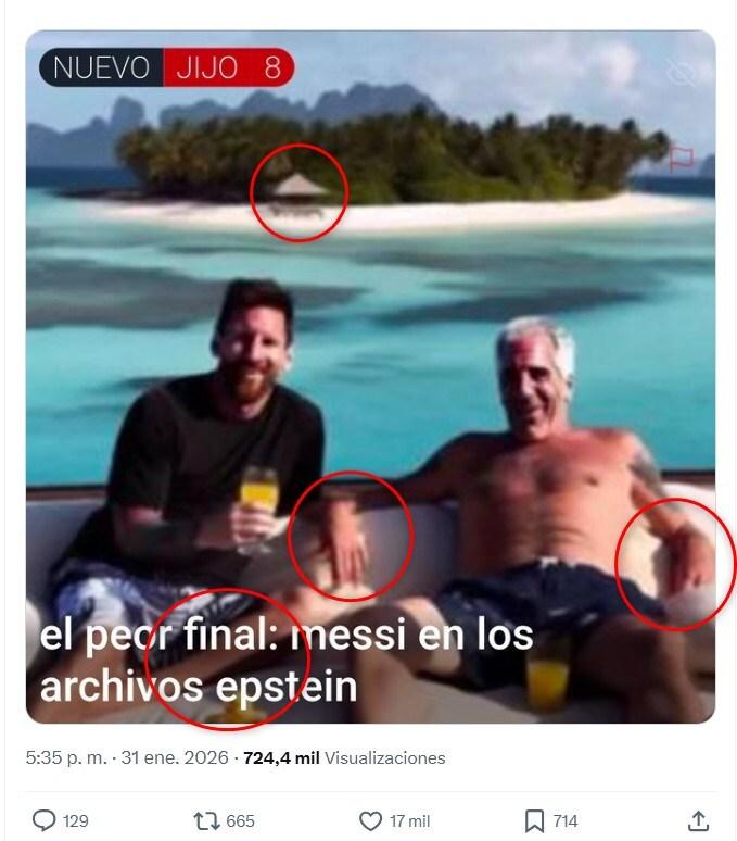 El 30 de enero de 2026 se publicaron tres millones de páginas relacionadas con el caso del delincuente sexual estadounidense Jeffrey Epstein, donde se mencionan varias figuras públicas. En ese contexto, más de 760 usuarios de redes sociales comparten una imagen donde se ve al magnate junto al argentino Lionel Messi, en lo que parecería ser una isla. Sin embargo, la escena tiene inconsistencias y no hay correspondencia temporal en el rostro del futbolista. Expertos señalaron a la AFP que la foto fue hecha con inteligencia artificial (IA).