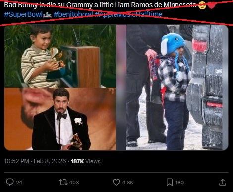 “Bad Bunny le dio su Grammy a little Liam Ramos de Minnesota”, escribe un usuario en X que compara las imágenes de Liam Conejo siendo arrestado y un menor con un premio Grammy en sus manos.
