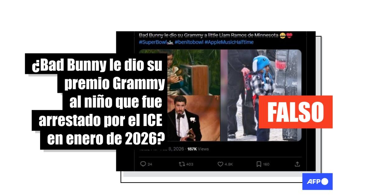 Bad Bunny protagonizó el 8 de febrero de 2026 el espectáculo de medio tiempo del Super Bowl. Desde entonces, más de 55.000 usuarios en redes sociales señalan que durante la transmisión el artista le otorgó su premio Grammy a Liam Conejo Ramos, el pequeño de cinco años arrestado el 31 de enero por el servicio de inmigración de Estados Unidos (ICE). Eso es falso. En realidad, el menor que recibió el galardón es el actor Lincoln Fox.