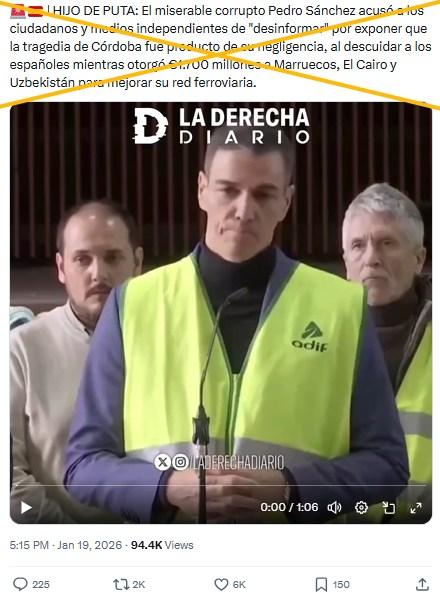 “El miserable corrupto Pedro Sánchez acusó a los ciudadanos y medios independientes de ‘desinformar’ por exponer que la tragedia de Córdoba fue producto de su negligencia, al descuidar a los españoles mientras otorgó €1.700 millones a Marruecos, El Cairo y Uzbekistán para mejorar su red ferroviaria”, asegura una publicación en X.