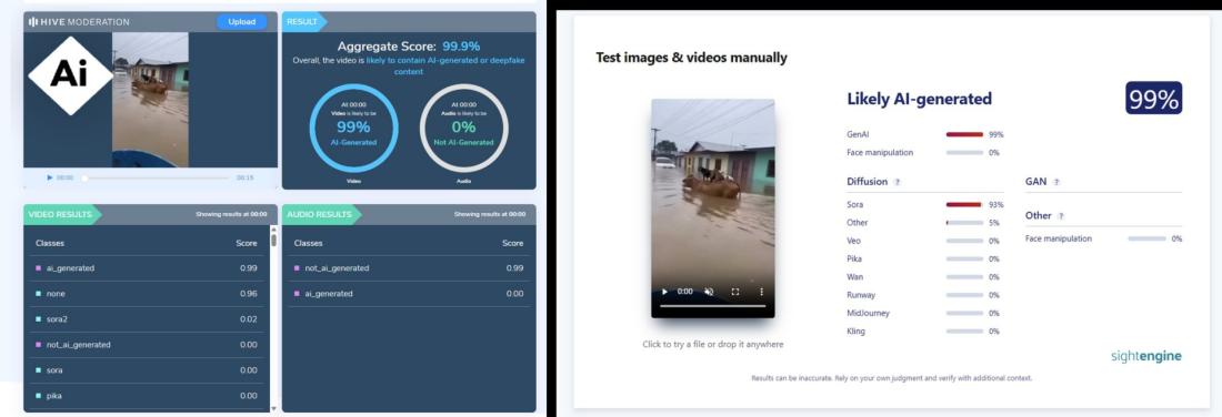 Un análisis con los detectores Hive Moderation y Sight Engine arrojó un 99% de probabilidad de que el material sea sintético.
