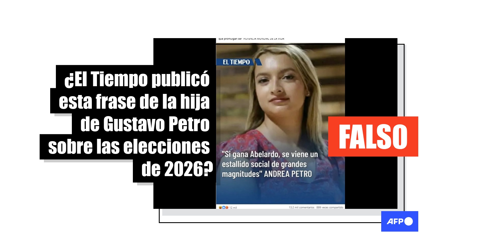 El abogado colombiano Abelardo De la Espriella, opositor al mandatario Gustavo Petro, puntea entre los candidatos favoritos a las elecciones presidenciales de mayo de 2026. En este contexto, circula en redes sociales una supuesta placa del diario El Tiempo con una cita de Andrea Petro, hija del mandatario, en la que amenaza con un “estallido social” si De la Espriella gana los comicios. Pero la gráfica, que acumula más de 4.000 compartidos, es un montaje. No hay registro de dicha frase y el medio desmintió su publicación.