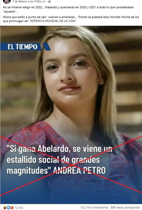 Una búsqueda avanzada en Google con las palabras clave “Abelardo”, “Andrea Petro” y “estallido” no arrojó evidencia de la supuesta frase. Tampoco se encontraron comentarios sobre el candidato en los perfiles en redes sociales de la hija del presidente (1, 2, 3).