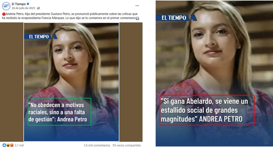 Es falsa una placa de El Tiempo con una “amenaza” de Andrea Petro sobre el candidato De la Espriella