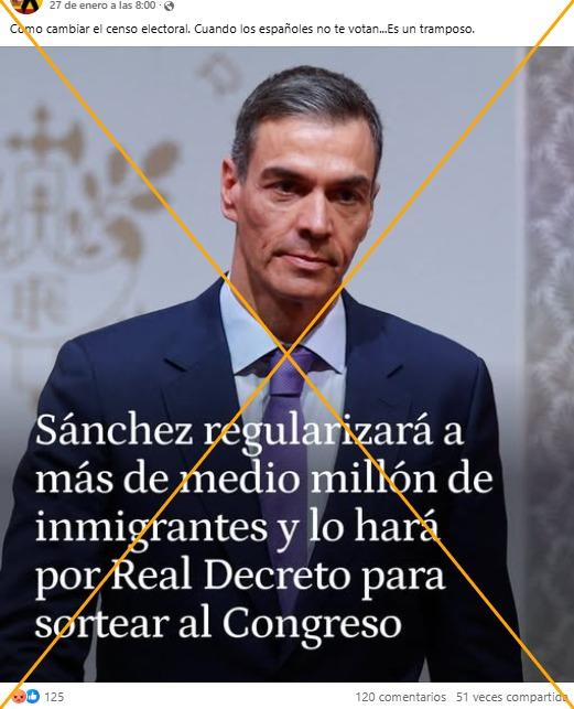 Un mensaje compartido en Facebook por el grupo del partido español Vox en el municipio madrileño de El Álamo afirma: “URGENTE | El Gobierno de Pedro Sánchez altera el censo electoral y pacta regularizar a más de 500.000 inmigrantes ilegales con la complicidad del PP [Partido Popular]. Incluso los que tienen una orden de expulsión vigente podrán quedarse en España”.