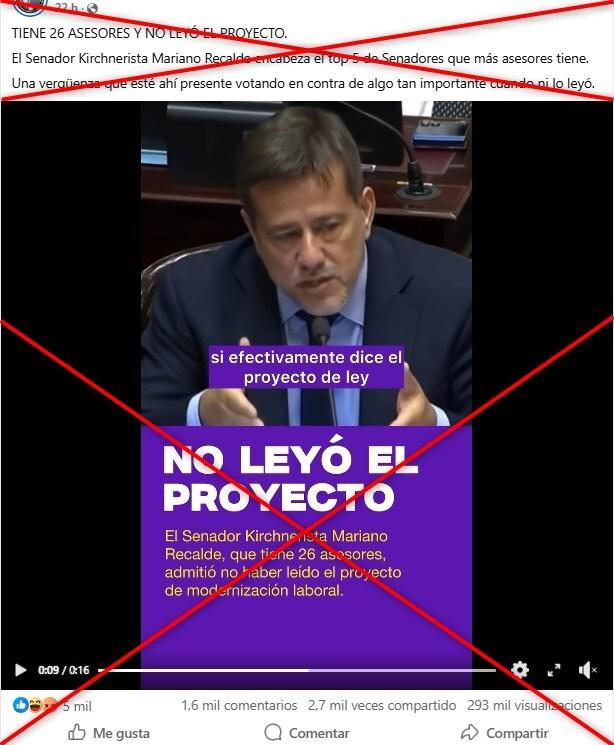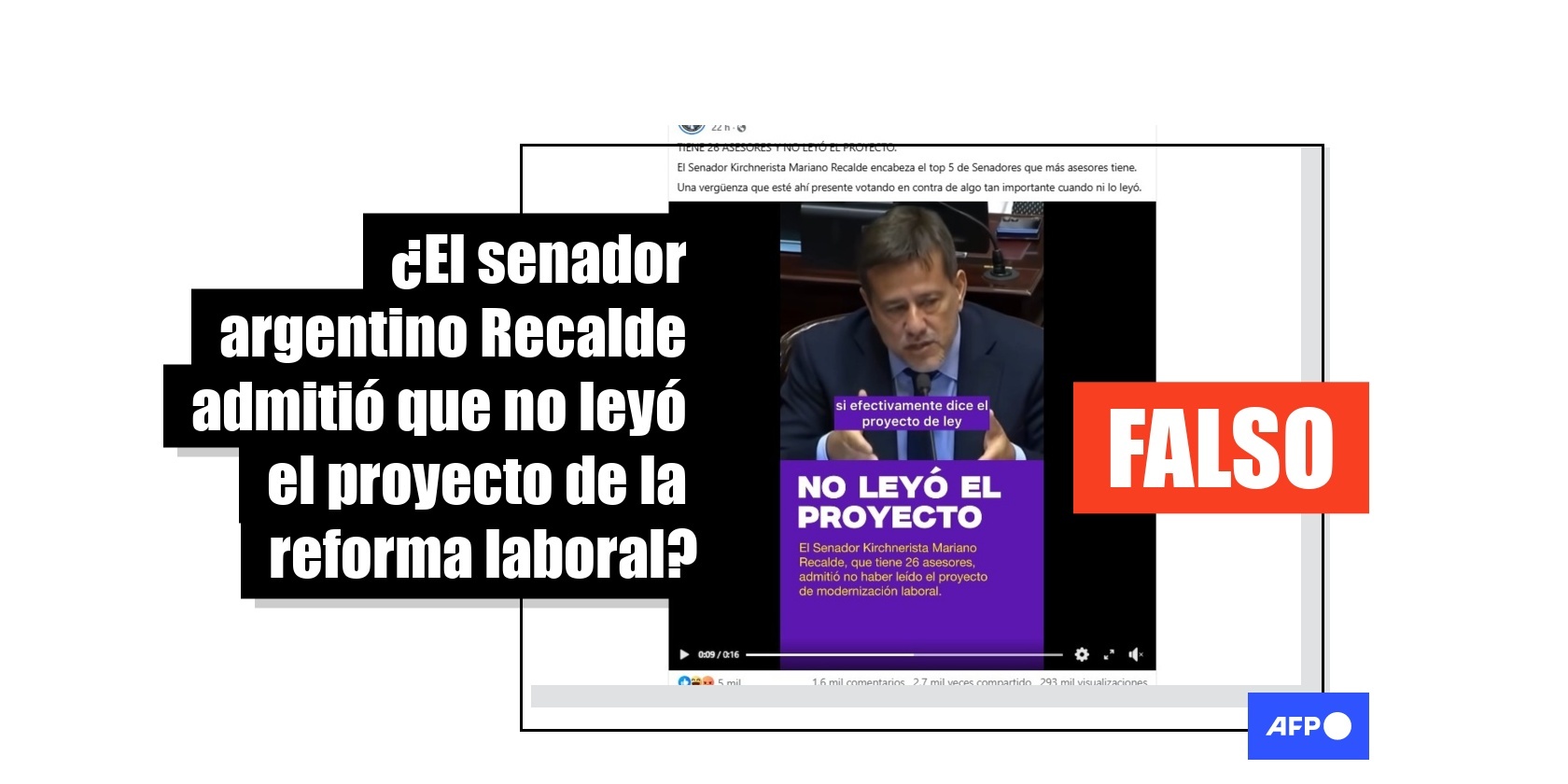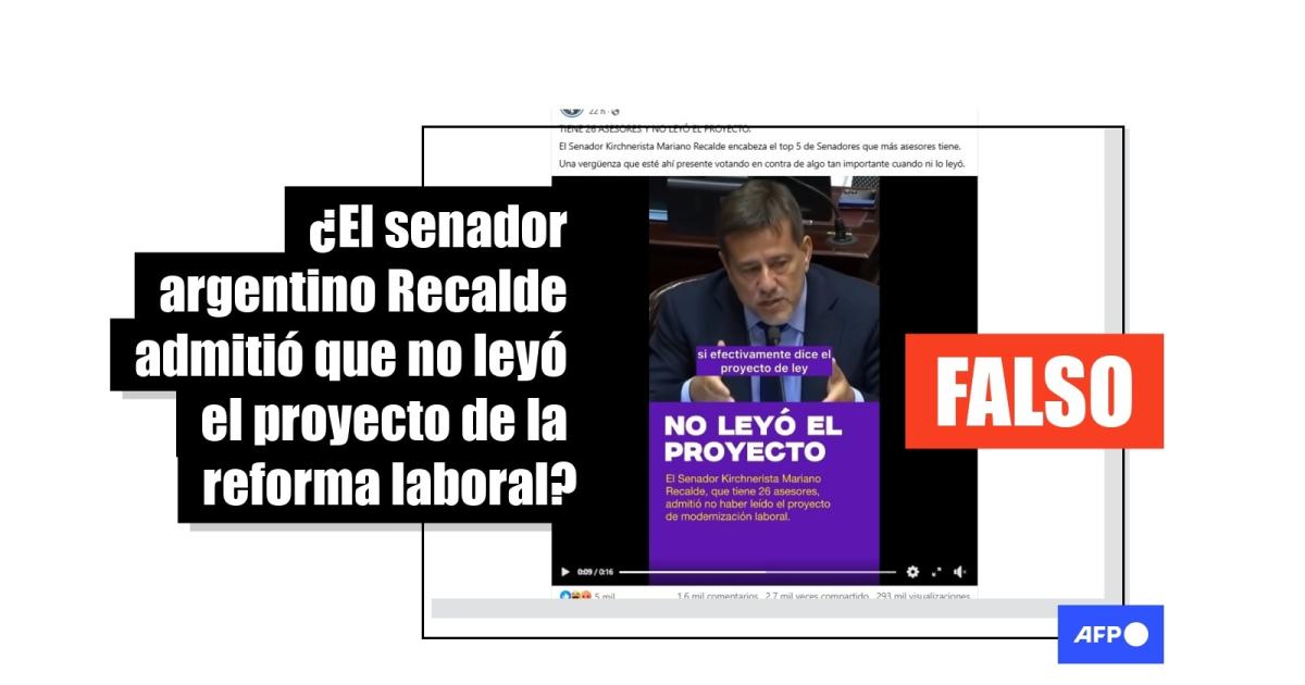 La reforma laboral impulsada por el presidente argentino, Javier Milei, fue aprobada por el Senado el 12 de febrero de 2026 y quedó en manos de Diputados. En ese marco, 6.000 usuarios en redes sociales afirman que el senador opositor Mariano Recalde admitió no haber leído el proyecto de ley, junto a un video de la sesión donde dice: “Quiero preguntar si efectivamente dice el proyecto de ley, porque no lo leí…”. Pero la secuencia está recortada antes de que finalice su explicación: se refería a que no halló en el texto cómo funcionaría el Fondo de Asistencia Laboral si quiebra del empleador.