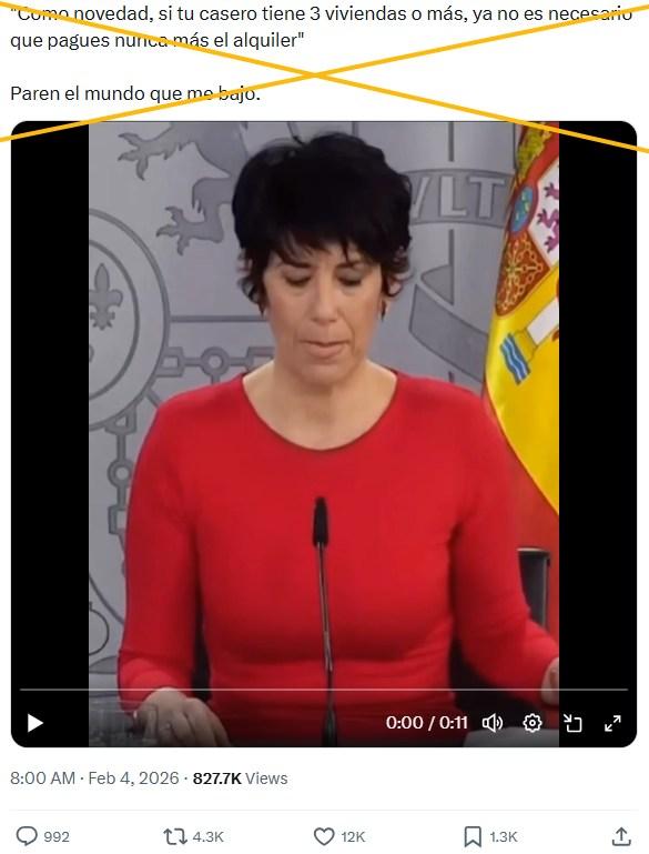 “‘Como novedad, si tu casero tiene tres viviendas o más, ya no es necesario que pagues nunca más el alquiler’. Paren el mundo que me bajo”, señala un usuario que comparte un video en X de la ministra de Inclusión, Seguridad Social y Migraciones y portavoz del Gobierno, Elma Saiz.