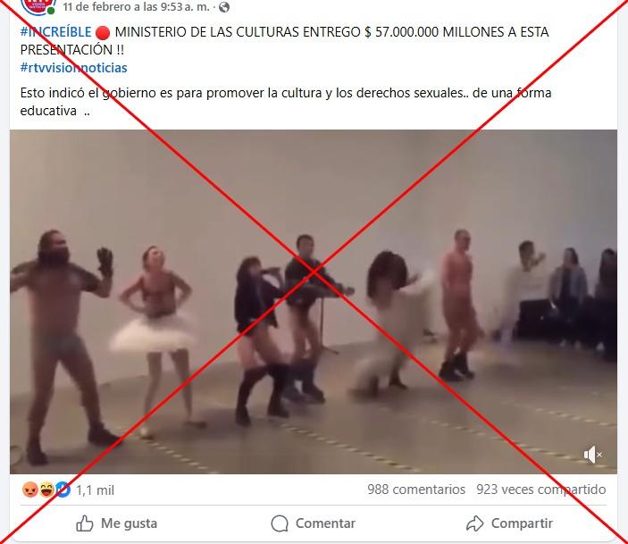 El Ministerio de las Culturas, las Artes y el Patrimonio de Chile entregó en enero de 2026 unos 49 millones de pesos chilenos en fondos concursables para el festival de cine para adultos “Excéntrico Fest”, lo que generó críticas de la oposición. Desde el 11 de febrero, más de 12.000 usuarios en redes sociales comparten un video de personas bailando semidesnudas, como si se tratara de una presentación del evento. Pero la secuencia corresponde a una performance artística realizada en 2017 en el Centro Cultural Recoleta de Buenos Aires, Argentina.