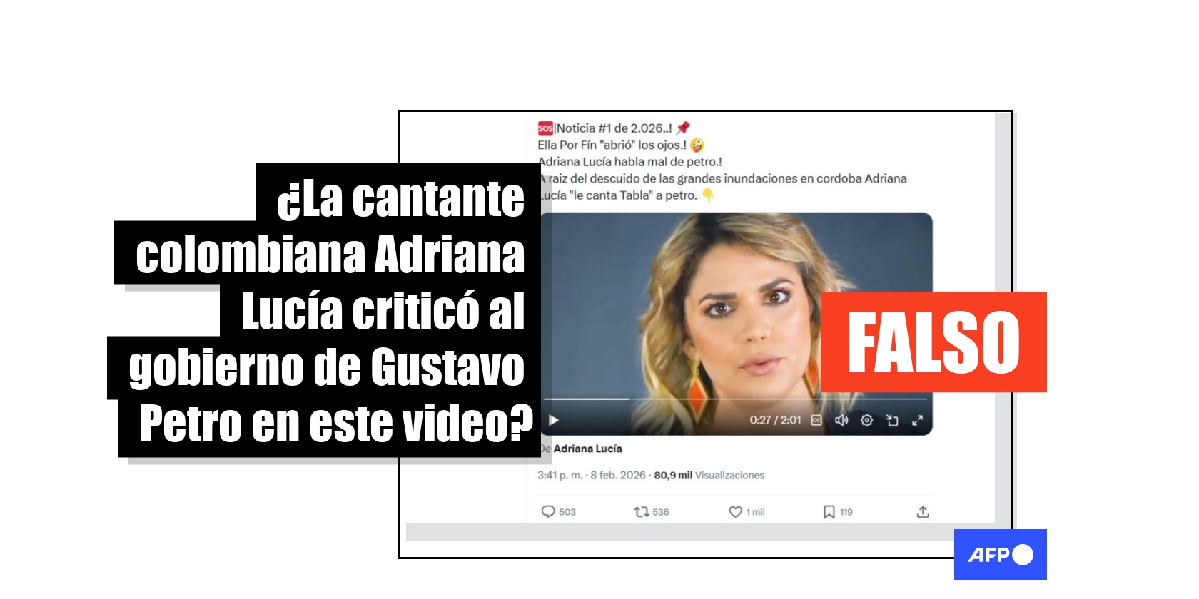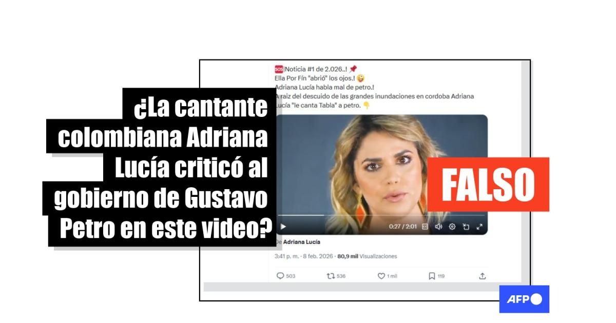 Colombia declaró emergencia climática en febrero de 2026 por fuertes inundaciones que azotan el norte del país, especialmente al departamento de Córdoba. En ese contexto, más de 7.000 usuarios en redes sociales han compartido un video de la cantante colombiana Adriana Lucía en el que supuestamente se queja de la gestión del mandatario Gustavo Petro, a quien apoyó en campaña. Pero el video de la artista data de 2019, cuando promocionaba una protesta contra el entonces presidente Iván Duque.