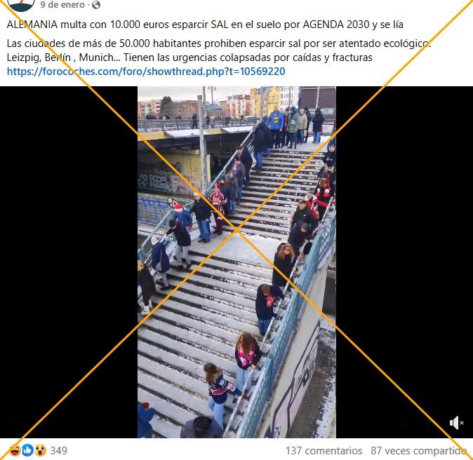 “ALEMANIA multa con 10.000 euros esparcir SAL en el suelo por AGENDA 2030 y se lía. Las ciudades de más de 50.000 habitantes prohiben esparcir sal por ser atentado ecológico. Leizpig, Berlín , Munich... Tienen las urgencias colapsadas por caídas y fracturas”, dice una publicación en Facebook.