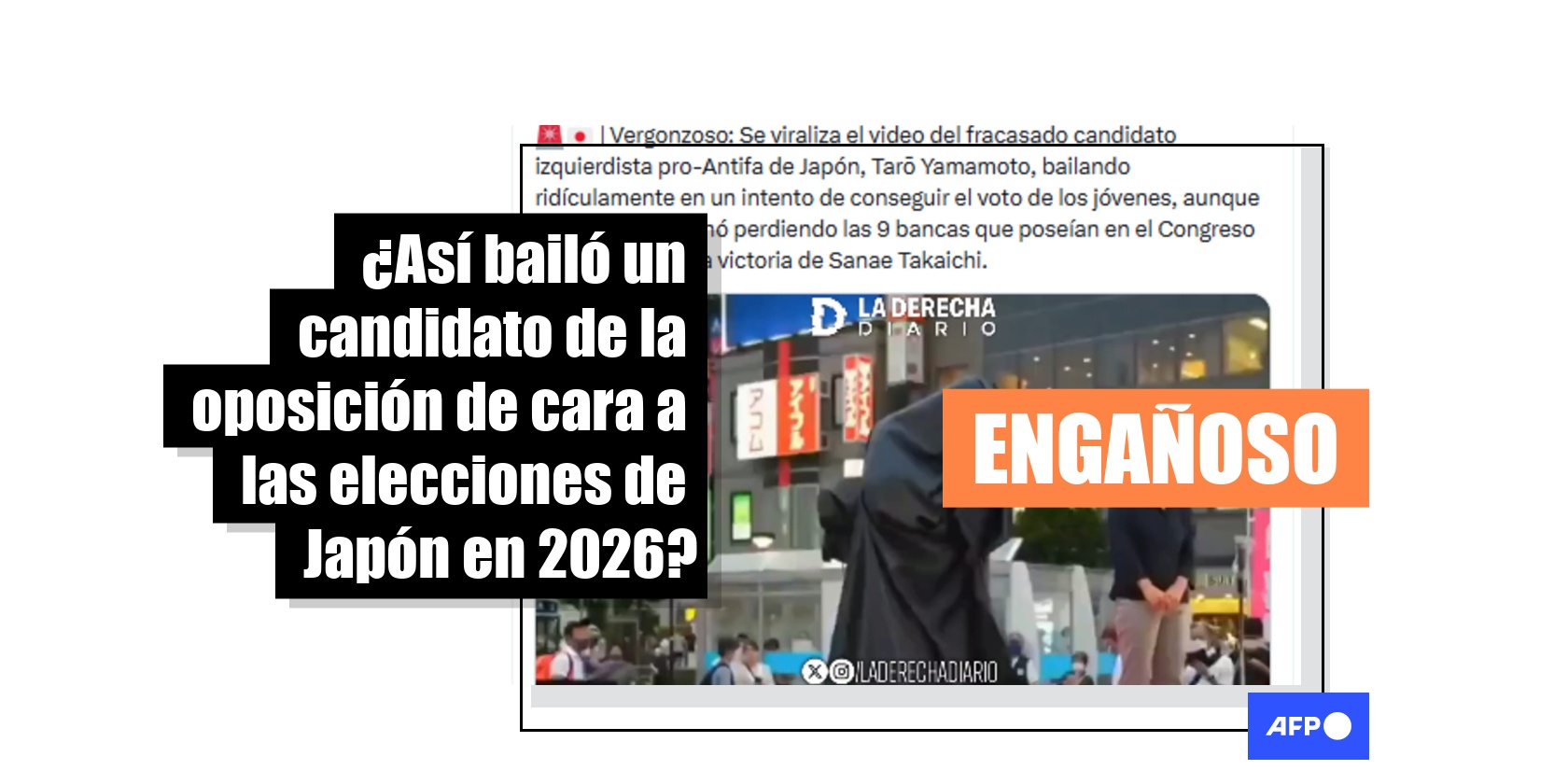 En las elecciones de Japón celebradas en febrero de 2026, el Partido Liberal Democrático de Japón, encabezado por Sanae Takaichi, obtuvo una mayoría de dos tercios en el Parlamento. Tras el anuncio de las primeras estimaciones de su victoria, circula en redes sociales un vídeo que mostraría al candidato de la oposición Taro Yamamoto intentando ganar votos para estos comicios. Pero las imágenes, compartidas más de 500 veces, son de 2022, cuando Yamamoto aspiraba a un escaño en la Cámara Alta.
