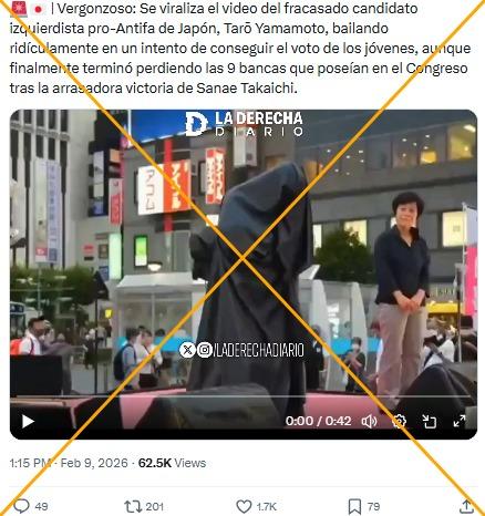 “Se viraliza el video del fracasado candidato izquierdista pro-Antifa de Japón, Tarō Yamamoto, bailando ridículamente en un intento de conseguir el voto de los jóvenes, aunque finalmente terminó perdiendo las 9 bancas que poseían en el Congreso tras la arrasadora victoria de Sanae Takaichi”, añade la publicación.